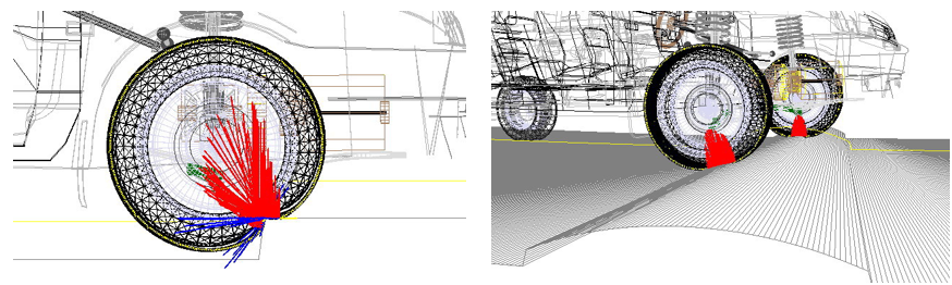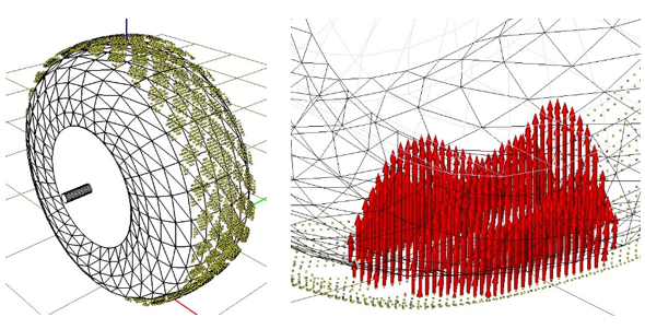 Для контакта шины с дорожным полотном реализуется щеточная модель взаимодействия, при которой контактная поверхность шины представляется набором упругих безынерционных щетинок, один конец которых связан с конечным элементом, а другой может вступать в контакт с опорной поверхностью, реализуя упруго-диссипативное взаимодействие в радиальном направлении и фрикционное – в касательном. На рисунке ниже желтые точки соответствуют концам щетинок, вступающим в контакт. Щетинки позволяют учитывать рисунок протектора шины.