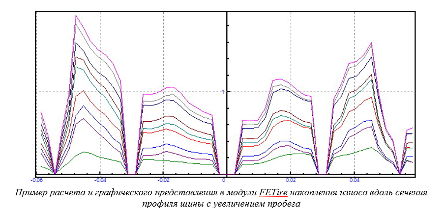 Также модуль FETire позволяет осуществлять моделирование износа шин. Для этого используется модель Арчарда износа протектора шины, в соответствии с которой скорость износа пропорциональна мощности сил трения скольжения. Контактная поверхность протектора разбивается на полосы. При недеформированной шине каждая полоса – это узкий цилиндр, диаметр которого совпадает с диаметром колеса, осью является ось вращения колеса. На срединной окружности отдельной полосы лежат точки контакта протектора с дорогой.